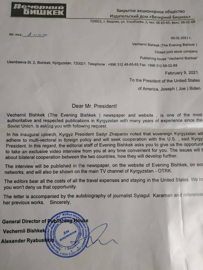 Однажды с Бакытом Басарбек мы написали и отправили официальные письма президенту Турции Р.Эрдогану и президенту США Дж.Байдену. После этого у меня была встреча и интервью с главой МИД Турции Мевлютом Чавушоглу, он мне сказал, что следующая встреча будет в Анкаре(!). То есть я стояла в шаге от встречи с турецким президентом, но НЕ мое предисловие к моему интервью в газете "Вечерний Бишкек" не дало сбыться нашему плану.