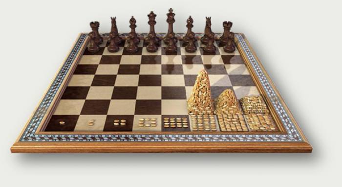 По легенде, когда создатель шахмат показал своё изобретение правителю страны, тому так понравилась игра, что он позволил изобретателю право самому выбрать награду. Мудрец попросил у короля за первую клетку шахматной доски заплатить ему одно зерно пшеницы, за вторую — два, за третью — четыре и т. д., удваивая количество зёрен на каждой следующей клетке. Правитель, не разбиравшийся в математике, быстро согласился, даже несколько обидевшись на столь невысокую оценку изобретения, и приказал казначею подсчитать и выдать изобретателю нужное количество зерна. Однако, когда неделю спустя казначей всё ещё не смог подсчитать, сколько нужно зёрен, правитель спросил, в чём причина такой задержки. Казначей показал ему расчёты и сказал, что расплатиться невозможно, разве только осушить моря и океаны и засеять всё пространство пшеницей.